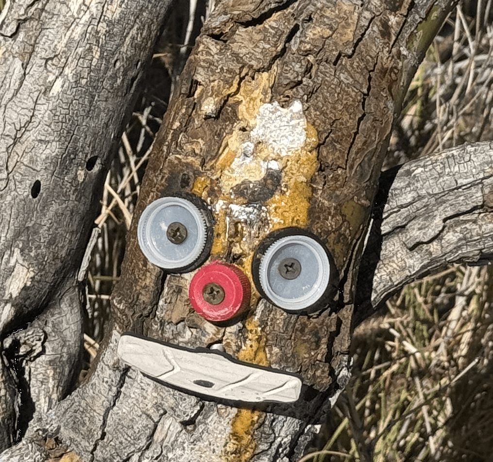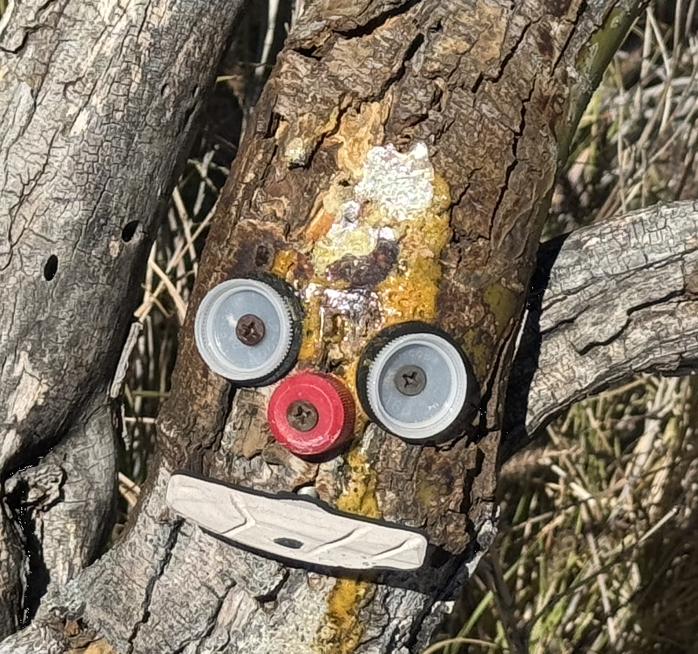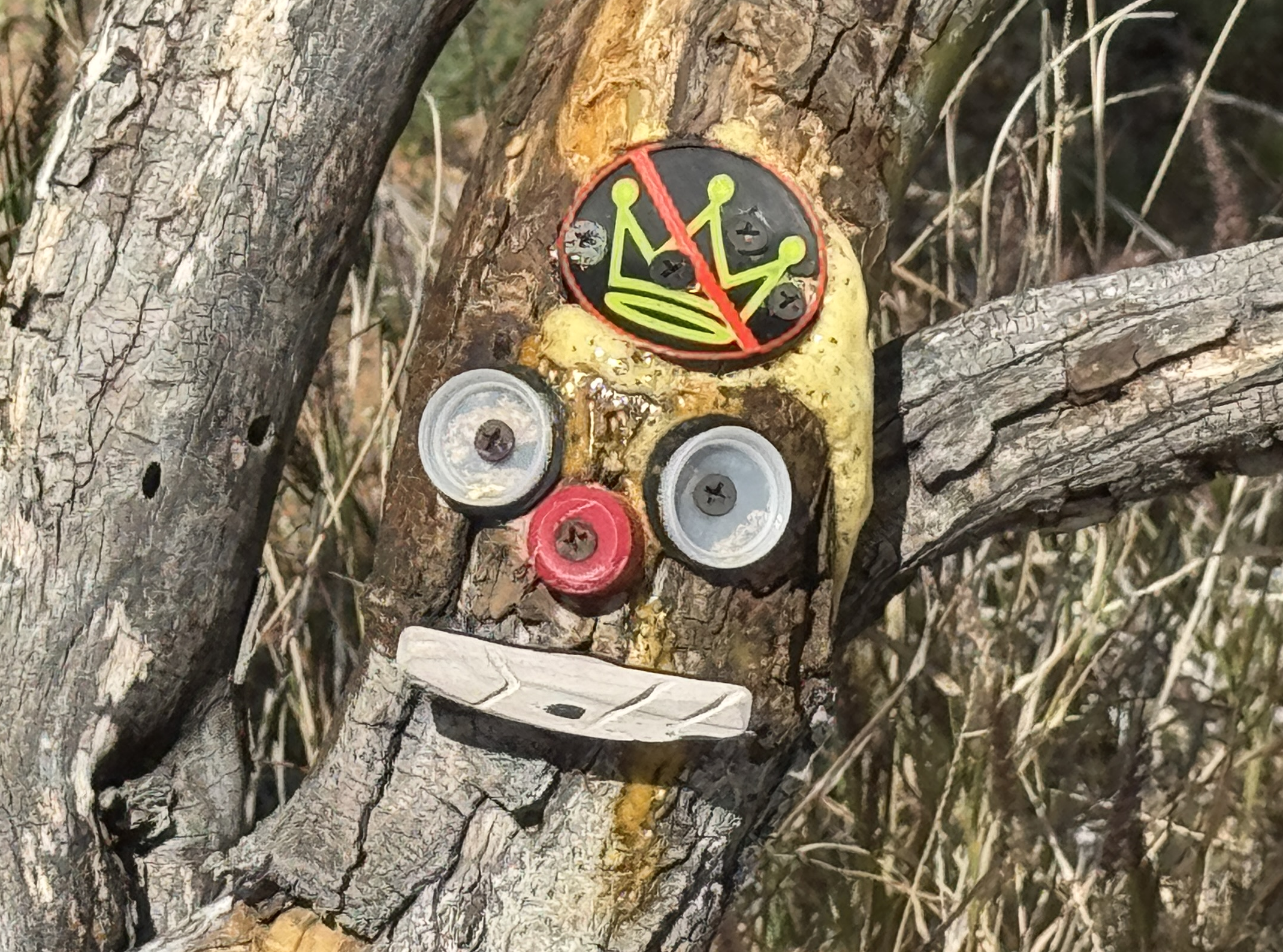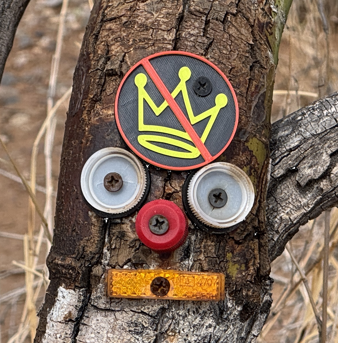Nobody bothered my “tree spirit” for quite a while. Then, some moron didn’t like the “No Kings” message. They broke it off one day. That’s when I had to make sure that the badge was mounted a bit more robust. I could see that the moron still didn’t like the message. Every day the badge sustained a bit more damage until…The moron finally succeeded in removing the badge entirely.