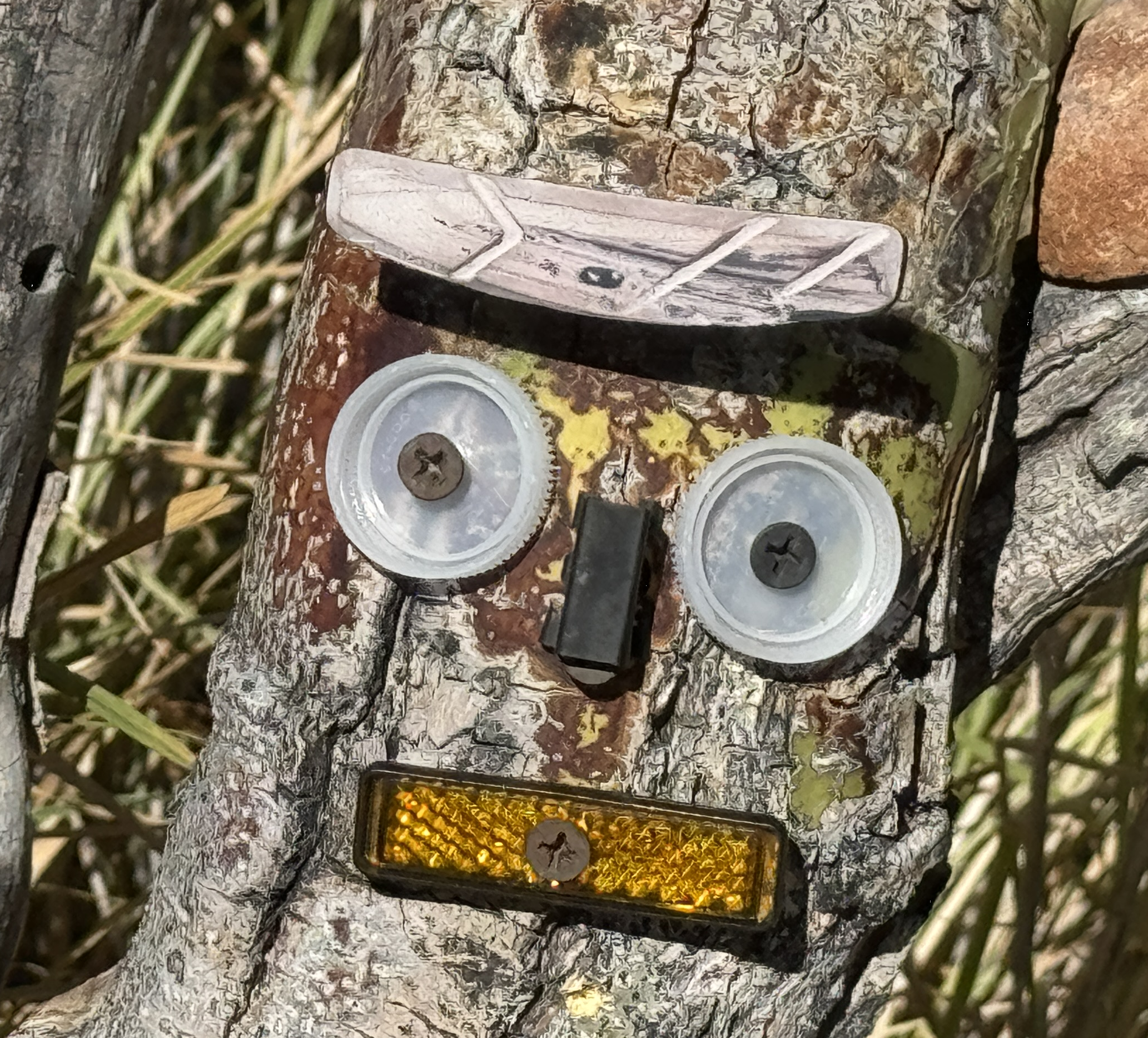 The “tree spirit” started out as a pair of water bottle lids and the rubber part of a bicycle brake caliper. Later, I moved him to a more prominent position on the stump and added a few more details. The brake part became his(?) hair and a dropped bicycle reflector became his mouth. His nose was a paper binder clip.