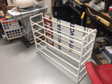 Camp Quest Arizona 2019 will be the end of June, but preparations have already begun. It’s a very busy week and proper preparations allow me to and the campers to get the most out of the experience. For the last three years, I’ve been building a simple set of shelves to take with me to camp. They consist of ½” PVC pipes and fitting along with repurposed political sign material—coroplast. Pictured are the three sets from the previous years. As you can see, they are full of stuff. My workshop always remains in a state of “organized chaos.” The hoarder quantity of raw materials contained there are sorted and labelled so that I have to spend less time looking for that all important widget that would be perfect for my most recent doo-dad. I’m sorry for all the technical jargon so let me briefly explain…my most recent “doo-dad” might be a Halloween prop or a cleaver way to ignite the fire at the beginning of the annual Winter Solstice celebration. In any case, now that the stuff is all sorted and labelled it doesn’t make sense to undo that. Therefore, I must build another set of shelves for this year’s camp. I’m running out of wall space however. So, what to do? This year I’m going to build a 10 shelf (taller) unit and transfer the containers from one of the shorter units to the bottom of the taller one. I only need 25 or so containers and the taller unit will hold 50. If I do this properly, I’ll pack away the disassembled smaller unit so that it won’t be used and full of junk stuff before next year’s Camp Quest and the cycle will be broken. That’s the plan.