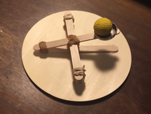 common materials such as Popsicle sticks, tongue depressors, fishing sinkers, rubber bands, and plywood circles. We’ll also be using hot glue so the building should go quickly.
