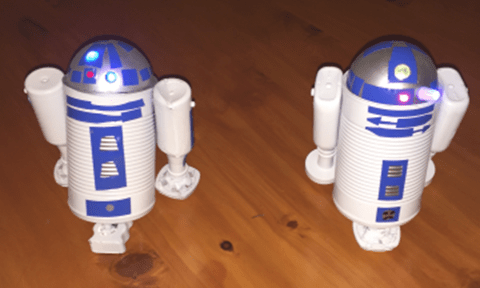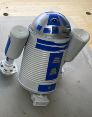 This is the first one that I built to use as an example for a Camp Quest AZ activity called “Tin Can Robots.” In all I built 5 examples: A Dr. Who Dalek, this R2D2, Rosie the Robot from the Jetsons cartoon show, Rocket Man, and Robby the Robot from the movie Forbidden Planet.