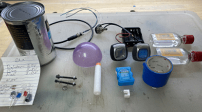 You may recognize this picture. Especially, if you are a long-time reader of this blog. It is a model of the Star Wars robot R2D2. It has LEDs that light up; it is crude. Most importantly, it is something made almost entirely out of recycled materials. The main body is a Healthy Choice soup can. The dome is from the top of a fabric softener bottle. The arms are made of small liquor bottles. The front foot came from my dentist. It had a small amount of dental floss in it originally, and the main feet are automobile deodorizers that I found on the side of the road. There are parts that I had to purchase, however. I used hot glue, two hex head bolts with matching nuts, multiple colors of spray paint, some vinyl tape, light emitting diodes, a few resistors, a battery holder, 3 AA batteries, and a switch.