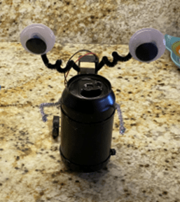 I had all the components for the “BevBot” pictured here. It’s a robot that moves and wobbles. It starts out as a beverage can. Amazon sells a similar “Tin Can Robot.” It costs about $10 but it has a lot of little, tiny parts. Also, it may take more than an hour to assemble. The cost isn’t a big issue, but I planned on every camper to build one. That means, I’d be buying about 50 of them. It pays to assemble my own kits. The tiny parts are a problem because our craft area, where all the “making” happens, is a wooden deck complete with narrow slots. Over the years, we’ve lost a lot of hardware through those slots. The campers have an hour to assemble and test out their robots. The resulting kit has only a few parts, no tiny ones, and builds fast.