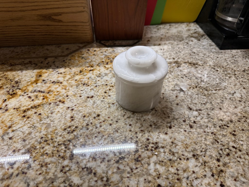 I am fond of my butter bell…Mine is made of marble and keeps a quarter pound of butter fresh and soft on my counter. However, reloading it is a mess. I get butter on my hands. Washing up required warm water and my water heater is distant from the kitchen sink, which requires I wait some time before washing my hands.