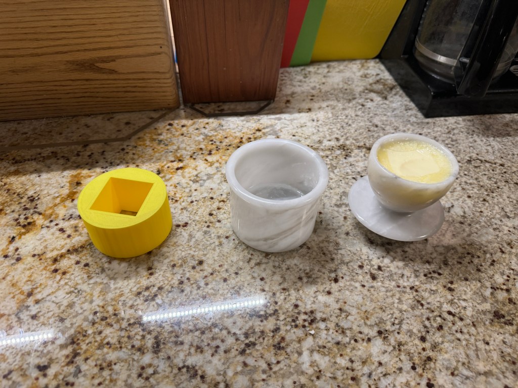 Therefore, I needed to go back to the physical method of pushing the room temperature softened butter into the bell. I tried a spoon. It worked OK, but the spoon is round and the hole in the device was square…Back to the printer…