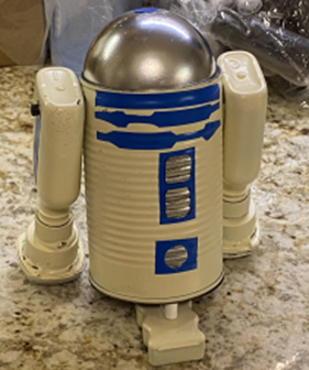 Next, I painted the can and the dome metallic silver. Finally, I masked a couple of small areas on the can and painted the can and the “arms” an off-white (ivory). The masked areas become the vents on the front of R2.